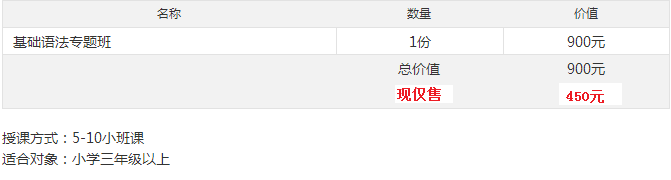 本課程內容涵蓋名詞,冠詞,介詞,代詞,形容詞,副詞,動詞,基本時態,基本句型:to have、to be、can等。本課程采用小班教學,教師對中小學教材和教輔研究透徹,并且在把握各個年級教學重點難點的基礎上,能夠對學生進行個性化學習指導。老師根據語法課程自身特點,通過各種教學方法,讓學生在課堂和課外做大量口頭和書面練習,使他們能夠對所學語法牢固掌握。