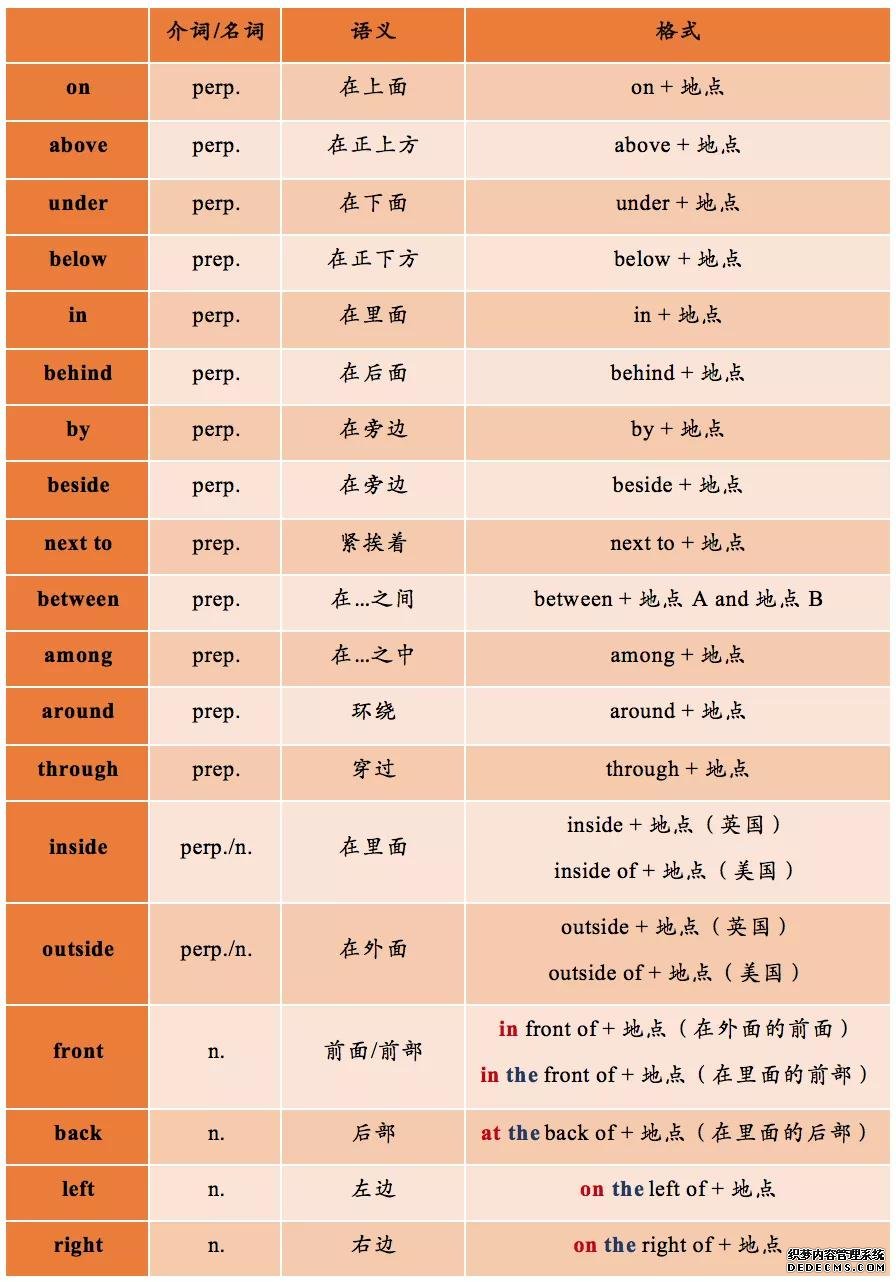 名詞方位詞包括front, back, left, right等等,在使用的時候需要先添加介詞,然后才能加地點名詞。