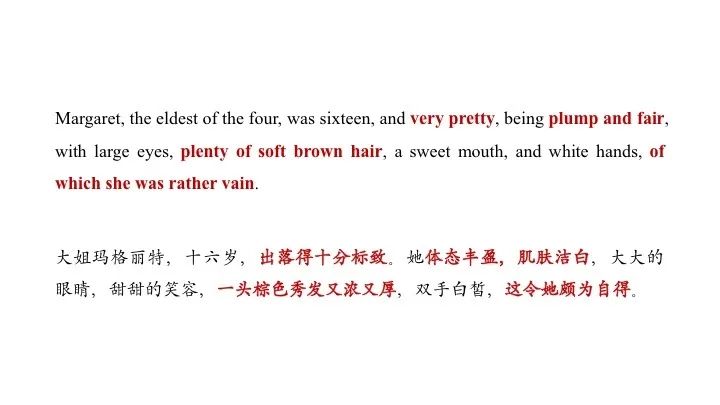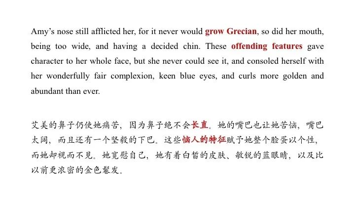 這一段描寫了Amy的鼻子、嘴巴、下巴、面龐,膚色,眼睛、頭發(fā)等等。作者從最重點的鼻子(Amy's nose still)出發(fā),帶出了嘴巴(so did her mouth)和下巴(and a decided chin),然后是面部整體(There offending features gave character to her whole face),再順理成章地轉(zhuǎn)折,談論膚色、眼睛和頭發(fā)(but she never could see it, but consoled herself with )