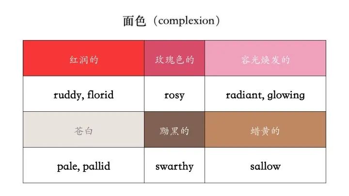 3. pale指“蒼白的”,pallid(/?pæl?d/)更進一步,指毫無血色,非常不健康的