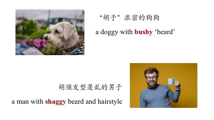 1. bushy來自名詞bush(灌木),指植物或者人的頭發(fā),動物的皮毛很濃密