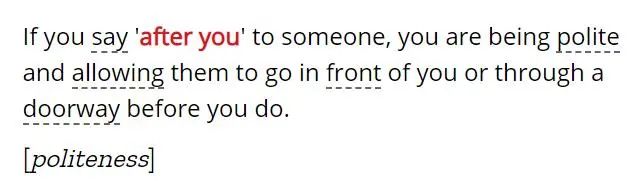 如果你對某人說 after you,就表示你在禮貌地允許別人走到你前面,或者先通過一道門