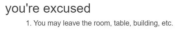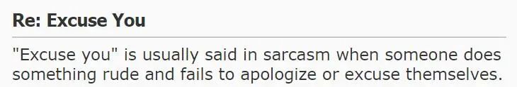 當老公打了個嗝,卻沒有請求原諒他(也就是沒有說“Excuse me”),老婆就可以說“Excuse you”。這是個諷刺和不友好的表達。