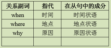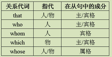 關系代詞指代先行詞,在定語從句中作主語、賓語或定語;關系副詞修飾先行詞,在定語從句中作狀語。我們通過下表來具體地了解一下。