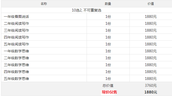一年級看圖說話、二至五年級閱讀寫作、一至五年級數(shù)學(xué)思維,十選二(不可重復(fù)選擇),原價3760元,現(xiàn)僅售1880元!僅20位!
