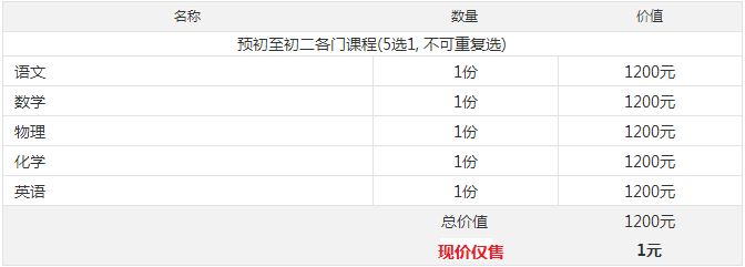 1.預(yù)初至初二各門課程五選一(不可重復(fù)選擇),僅售1元,價值1200元寒假初中超前專題班!