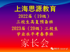 家 長 會 6月6日, 思源教育2022屆 三校生高復預備班和2023屆學業水平考春季班 在徐匯校區先后舉行了2場家長會。此次會議主要分為三個部分,第一部分是22/23屆家長會,第二部分是對21屆55個本科錄取的優秀學員進行表彰會,第三部分為高復咨詢。 (徐匯家長會現場) 會議由思源高復專家黃老師主講,首先黃老師 代表學校感謝家長一直以來對思源的大力支 持, 與家長通報了學生春季的教學情況和在校期間的綜合表現 。然后對于學生們在校期間的成績,結合今年三校生高復的形勢給家長們做了具體的分析。黃老師坦言,今年預備班和學業班在讀學員的成績不俗,如果跟著老師的高復進度一步一個腳印,有望突破21屆55個本科錄取的高復記錄。 (2021屆思源三校生優秀學員分享高復心得) 會上,黃老師把思源三校生高復班的日常管理及校歷安排給家長做了...