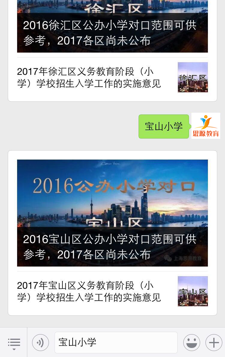 例:如果你在寶山區,那么你如果需要查看幼升小相關信息,直接在對話框中回復“寶山小學”即可。