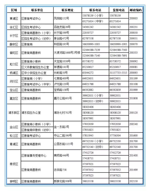 2017年上海市義務教育階段學校招生入學咨詢單位、電話一覽表