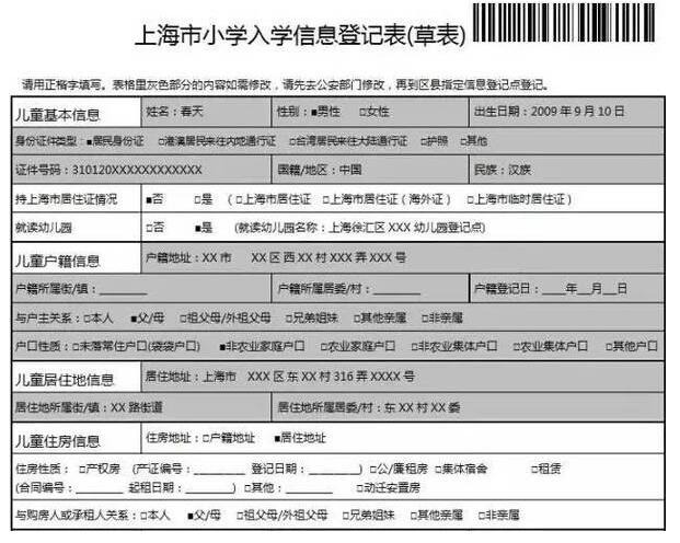 在園適齡兒童:家長在幼兒園登記孩子入學信息,獲取《上海市小學入學信息登記表》。本市戶籍人戶分離的適齡兒童在進行入學信息登記時,家長可選擇確定在戶籍地就讀還是在居住地就讀的意愿,事先請關注各區縣教育行政部門公布的“人戶分離”適齡兒童入學實施細則。