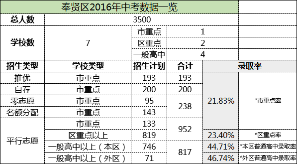 附上奉賢區2016年的中考錄取數據情況!