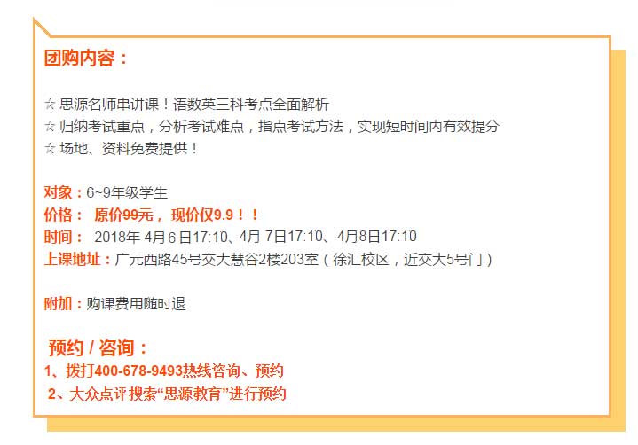 近上海的氣溫不斷攀升,溫暖的春天已然到來。但比起近來的好天氣,學生朋友及家長朋友們最關心的還是本學期的期中考試吧!初三的學生更不必說,初中二模考進入倒計時,開考在即~不知大家復習得如何?別擔心,咱思源教育給大家送上考前神器————語數英考前沖刺班課程!周末只需要短短兩小時,就能幫你抓住考試脈搏,摸清考點,快速提分。