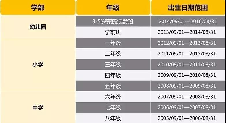 請(qǐng)參考以下圖表中上海赫德雙語(yǔ)學(xué)校2019/2020年可接收申請(qǐng)的年級(jí)及所對(duì)應(yīng)年齡。