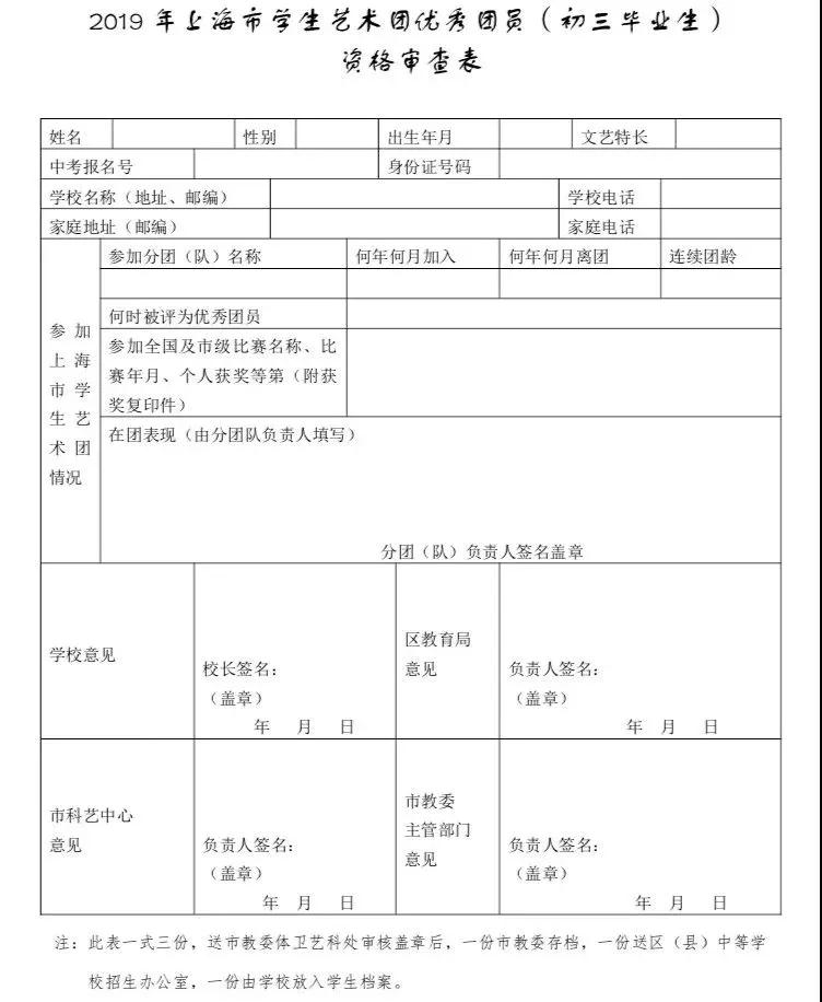 (二)在上海市學生藝術團中的應屆初中畢業生,經所在團考核,被評為優秀團員的,填寫《2019年上海市學生藝術團優秀團員(初三畢業生)資格審查表》(見附件3),經所在團、就讀學校、區教育局及上海市科技藝術教育中心認定,并在就讀學校校內公示5個工作日后,才能取得文藝特長生資格。具備文藝特長生資格的應屆初中畢業生名單須于4月15日前報市教委體衛藝科處,由市、區統一公示。