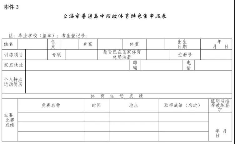 (三)符合上述條件,并在義務教育階段八、九年級具備以下條件之一者可填寫《上海市普通高中招收體育特長生申報表》(以下簡稱《申報表》,見附件3)參加報名。