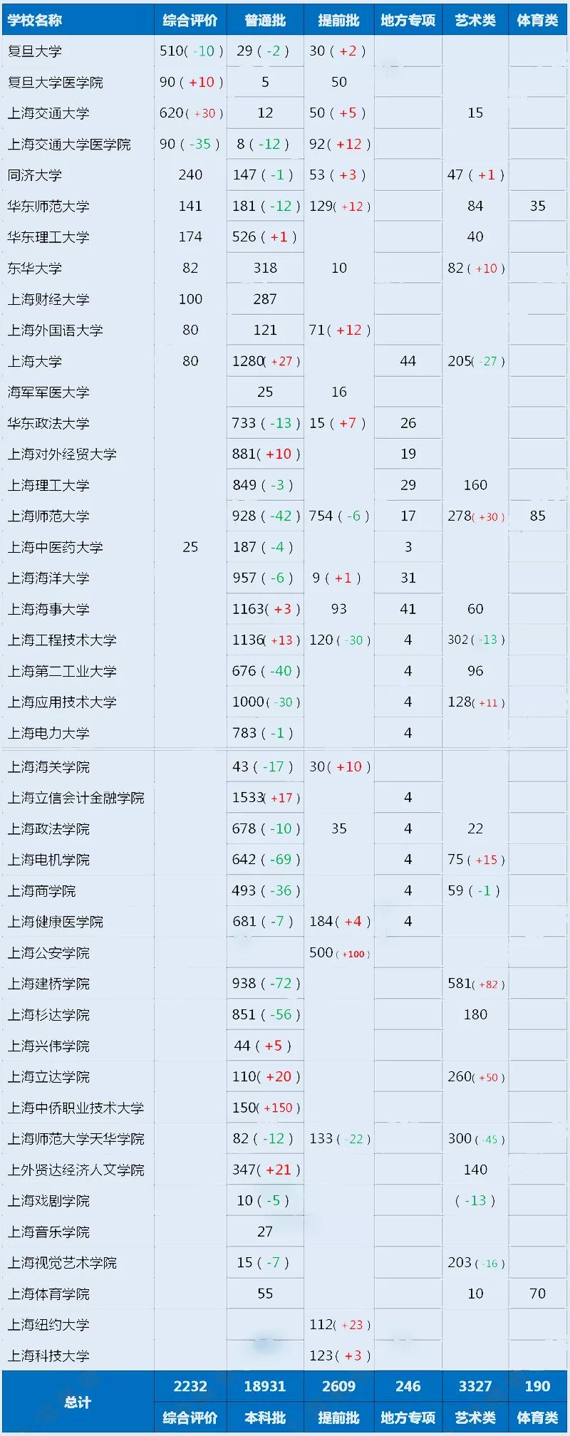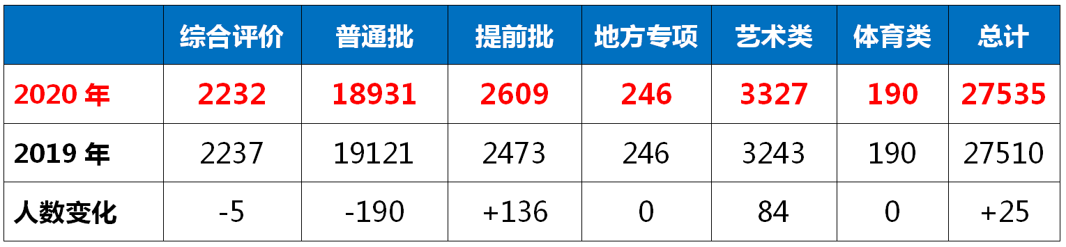 2020年上海本地高校的本科總計(jì)劃招生27535人,與去年相比增加25人,各批次人數(shù)變化見下表:
