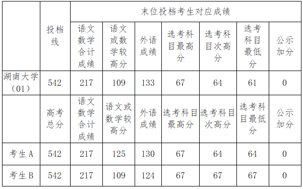 若考生成績與投檔線相同,如考生A、考生B兩人的高考總分均為542分,與所填報的湖南大學(01)[投檔線542分]相同,且兩人填寫在湖南大學(01)之前的院校專業(yè)組志愿投檔線均高于542分,則這時候就要通過末位投檔考生對應成績來進行判斷: