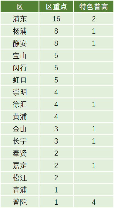 上海市重點高中共有71所(本校+分校區(qū)+享受市重點高中招生政策學校),市特色普高12所,區(qū)重點高中73所,一般高中94所。上表已將上海市區(qū)重點高中收錄完全。