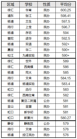 中考平均分在580+以上的有11所初中,徐匯楊浦虹口的初中占領了大部分的席位,在全市范圍內也是非常突出了!