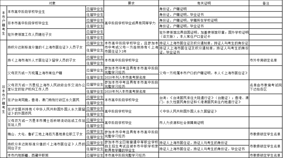 注:春季考試報名考生不含本市中等職業學校(含中專、職校和技校)的應屆畢業生;18至24周歲男性公民須經查驗兵役證(符合報名條件的外國僑民、在滬臺胞、香港及澳門特別行政區永久居民身份除外);各類證件須在有效期內。