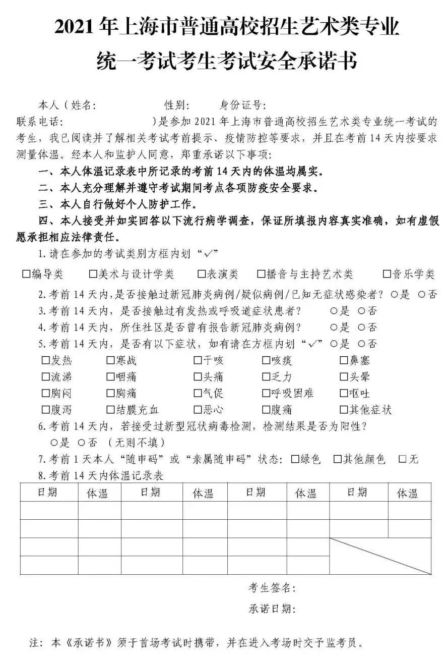 1.考前14天,考生須完成本人“隨申碼”注冊或“親屬隨申碼”申請。同時下載《2021年上海市普通高校招生藝術類專業統一考試考生考試安全承諾書》(以下簡稱《承諾書》),并按照《承諾書》要求如實、完整填寫相關信息。