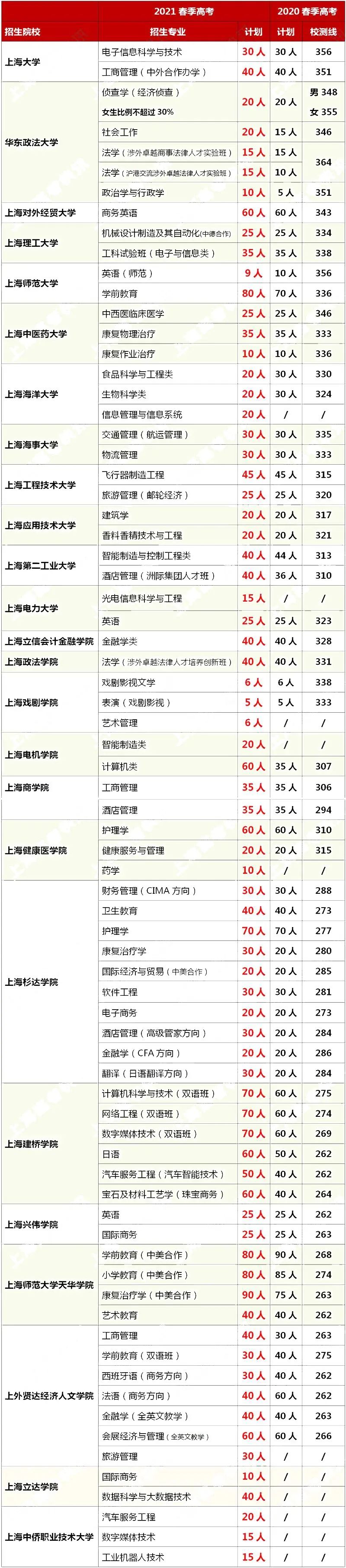 2021年上海春考8個專業(類)與2020春考相比較專業方向或所含專業有變化,分別是上海理工大學工科試驗班(電子與信息類)含測控技術與儀器、電氣工程及其自動化、電子信息工程、通信工程、光電信息科學與工程、醫學信息工程、人工智能、自動化、計算機科學與技術、智能科學與技術、數據科學與大數據技術、新媒體技術、信息管理與信息系統13個專業,2020年春考電子信息類含光電信息科學與工程、電子信息工程和通信工程3個專業;上海海事大學交通管理(國航)專業2020年春考為交通管理(航運管理)專業;上海立信會計金融學院2021年春考實行大類專業,金融學類分流專業為:金融學、投資學、信用管理、金融學(浦江班),2020年春考為金融學(浦江班);上海第二工業大學2021年春考智能制造與控制工程類所含專業:材料成型及控制工程、機械電子工程、自動化、測控技術與儀器、車輛工程、工業工程、信息管理與信息系統、智能制造工程、復合材料成型工程),2020年春考智能制造與控制工程類所含專業:機械工程、材料成型及控制工程、機械電子工程、自動化、測控技術與儀器、車輛工程、工業工程、信息管理與信息系統、智能制造工程、復合材料成型工程);上海電機學院2021年春考智能制造類(電氣工程及其自動化(德國學分互認項目)、機械電子工程(德國學分互認項目)、物流管理(德國學分互認項目))中的電氣工程及其自動化、機械工程在2020年春考分別招生10人,校測線分別為300、310分;上海商學院酒店管理在2020春考招生為酒店管理(國際酒店集團訂單班);上海政法學院法學(涉外卓越法律人才培養創新班)在2020年春考招生為法學(國際經濟法方向);上海杉達學院電子商務在2020年春考招生為電子商務(商務數據分析方向)。