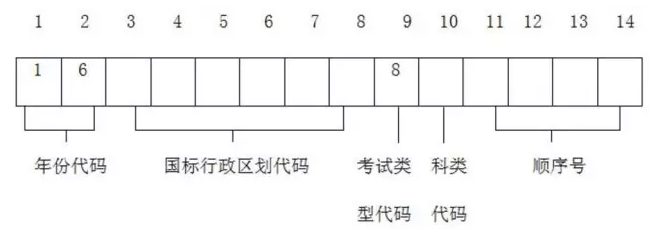 1.采用教育部規定的全國統一的14位報名號編制方法,內容包括“年份”、“國標行政區劃”、“考試類型”、“科類”、“順序號”五項。具體如下: