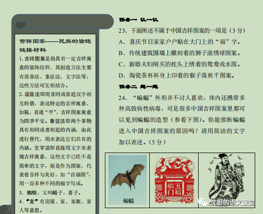 某校開設“中國傳統文化”選修課,本節課要講的內容是“中國吉祥圖案”,講課老師邀請你來上課,請你閱讀鏈接材料并完成三個任務。