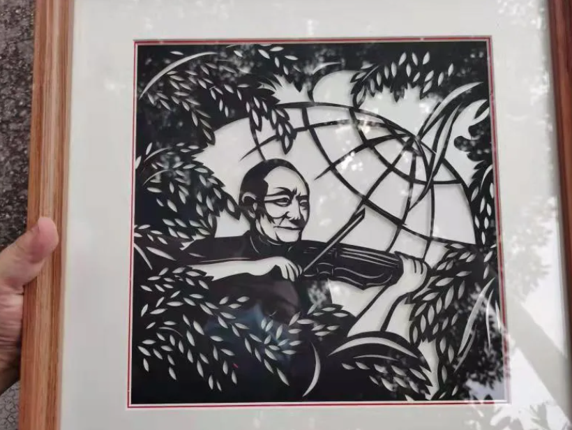 Someone used paper cutting to depict Yuan Longping playing violin under rice spikes.