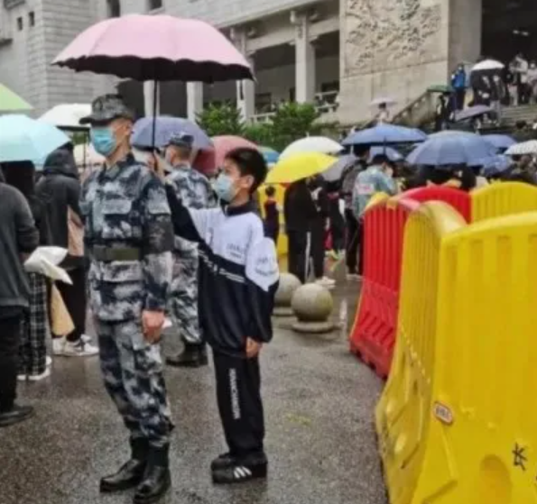 還有很多學生,主動給一旁淋著雨維護現場秩序的武警官兵們打傘……