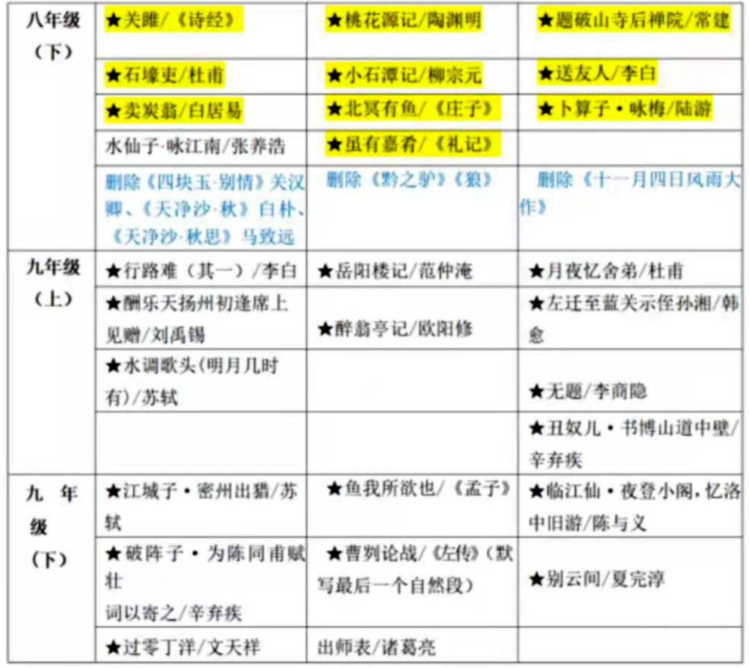 古文篇 刪除 生于憂患,死于安樂/《孟子》、孔孟論學(默寫前四則)/《論語》《孟子》、黃生借書說/袁枚、濰縣署中舍弟墨第一書/鄭燮,增加 答謝中書書/陶弘景、記承天寺夜游/蘇軾、《愚公移山》/《列子·湯問》。