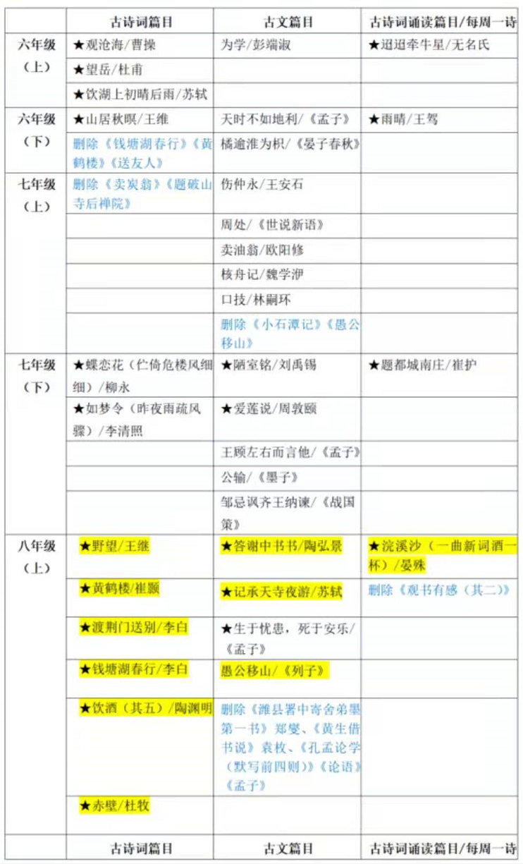 六年級(下):古詩詞篇目 刪除《錢塘湖春行》/白居易、《黃鶴樓》/崔顥、《送友人》/李白。