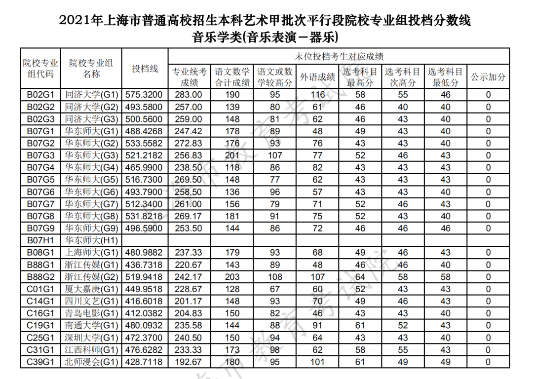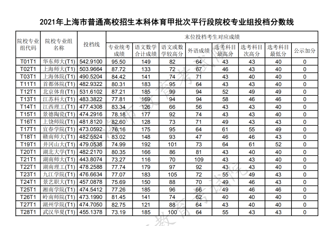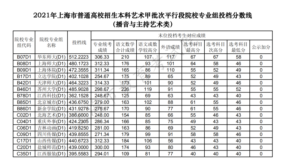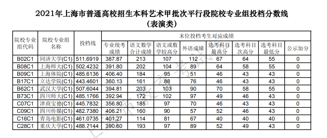 2021年上海市普通高校招生本科藝術、體育甲批次平行段院校專業組投檔線