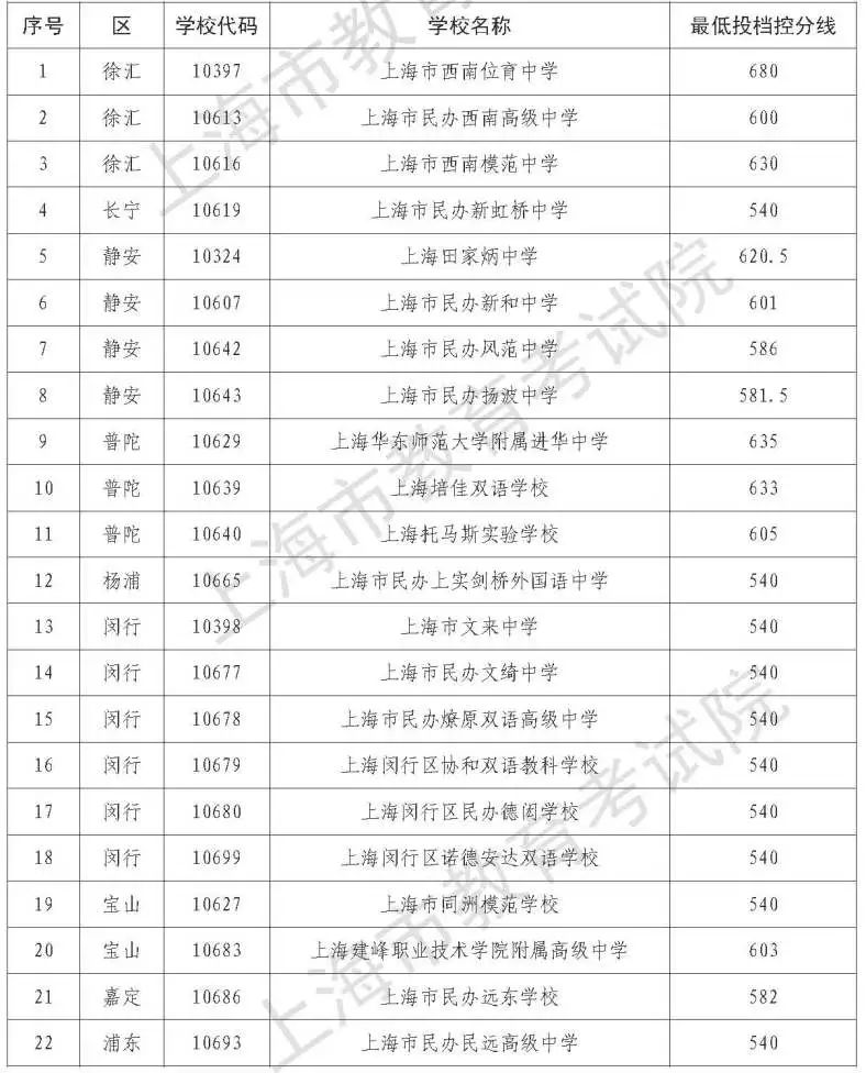 根據《上海市教育委員會關于2021年本市中等學校高中階段考試招生工作的若干意見》(滬教委基〔2021〕8號)文件精神,現將2021年上海市民辦高中最低投檔控制分數線公布如下↓