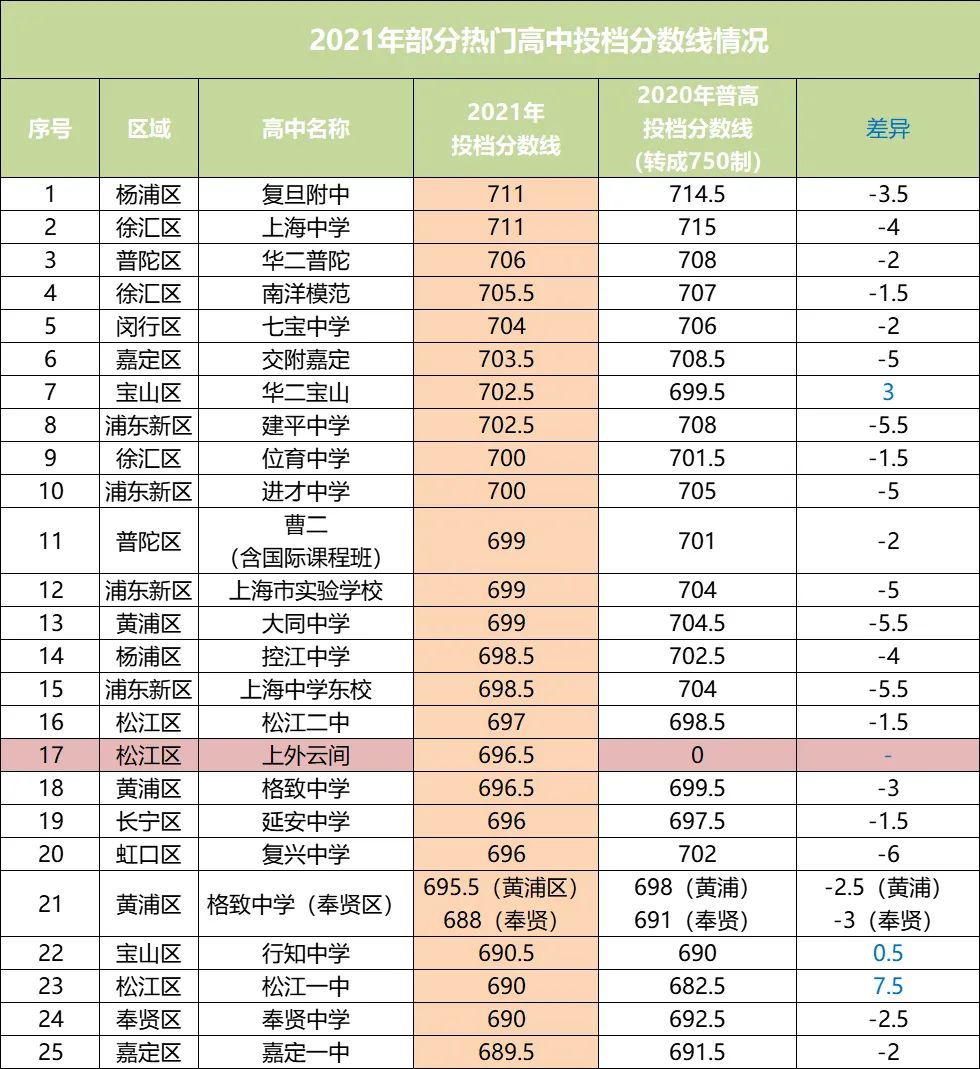 不過將去年的分?jǐn)?shù)線也轉(zhuǎn)換成750分制之后,我們就不難發(fā)現(xiàn),大部分市重點(diǎn)高中的得分率要求相比去年都是降低的,只有華二寶山、行知中學(xué)和松江一中等幾所學(xué)校出現(xiàn)了上漲。