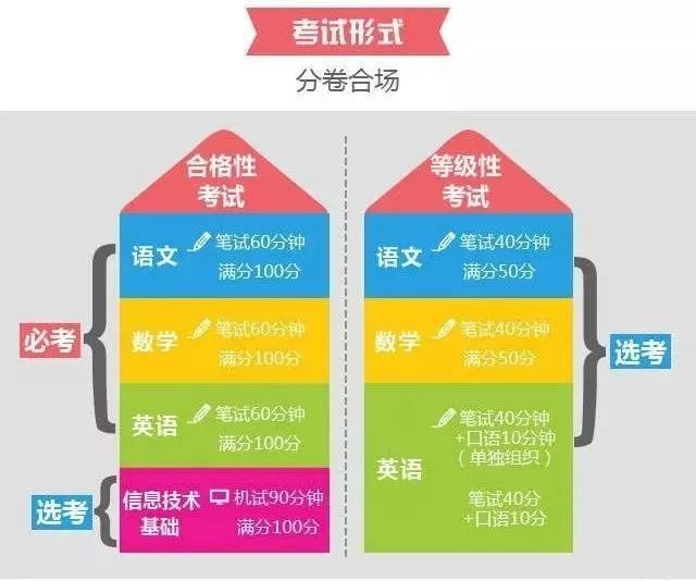 其中語文、數學、英語的合格考部分為必考科目,等級性考試為選考科目。合格考滿分100分,等級性考試滿分50分。
