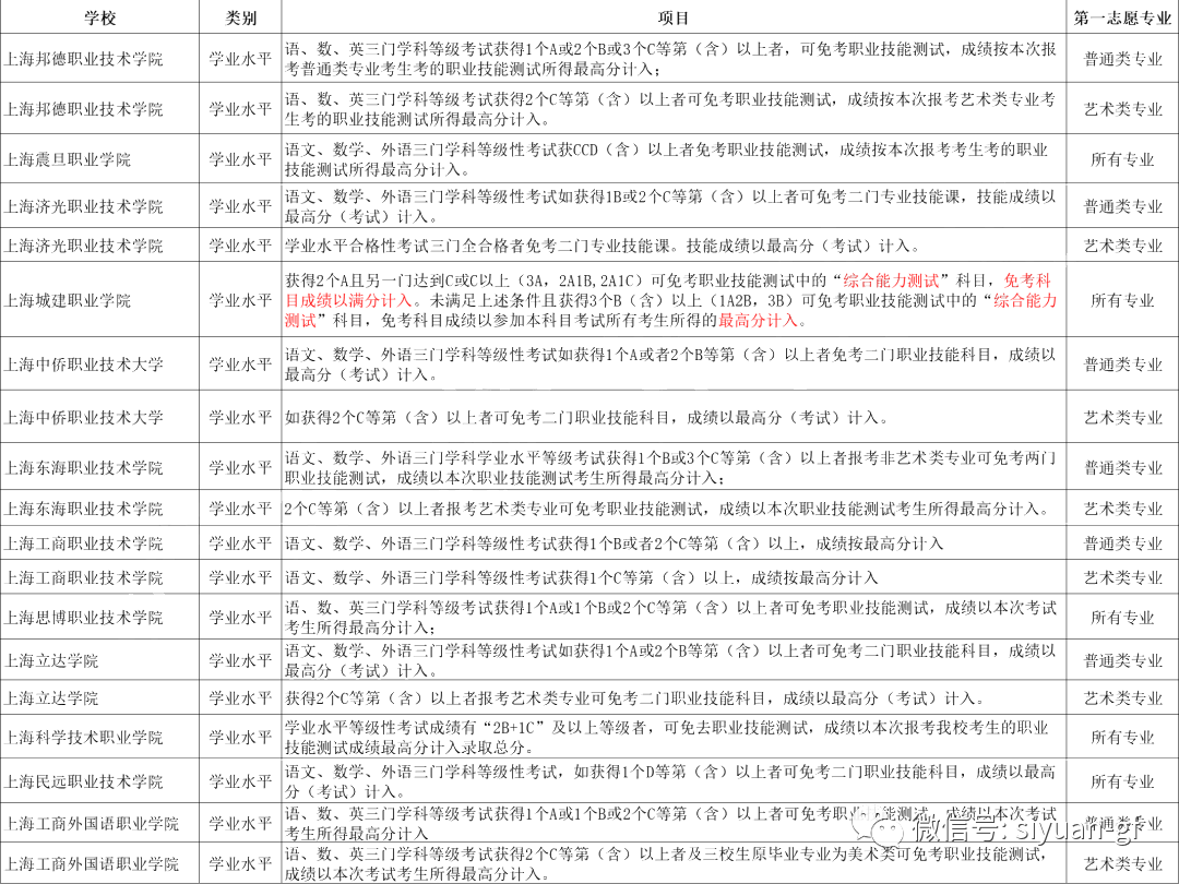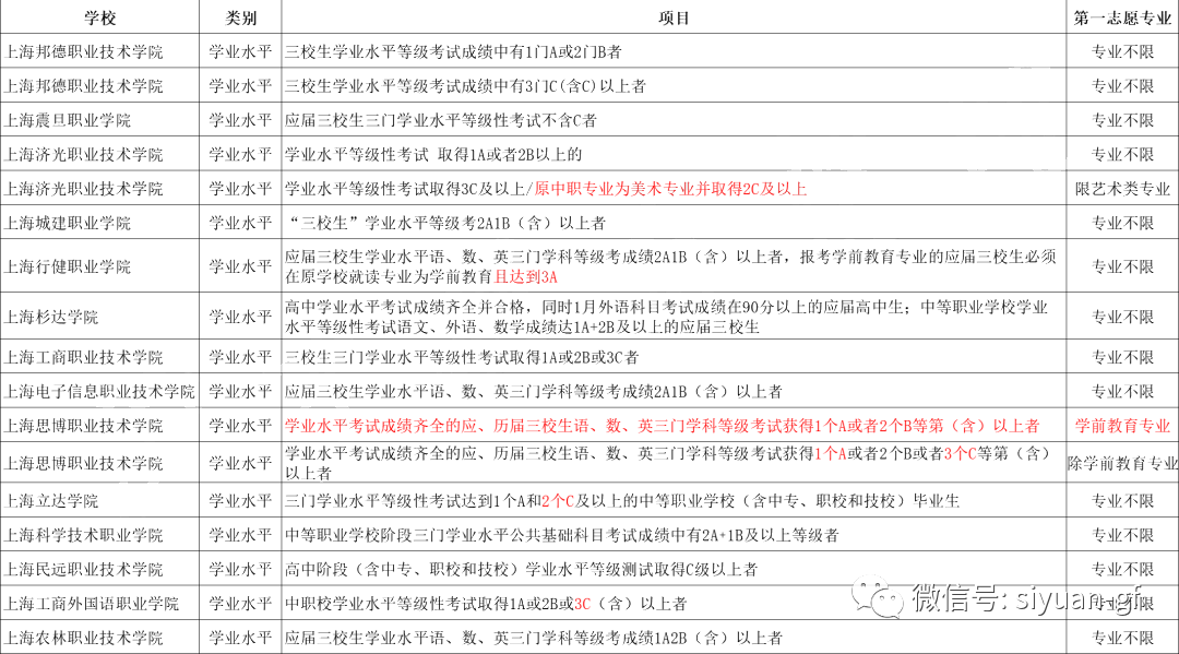 上海市部分普通高校專科層次依法自主招生中,使用中等職業學校學生學業水平語文、數學、英語3門科目等級進行折算。每門科目的等級以市教育考試院組織的考試成績為準。其中,A+為滿分70分,E計40分,相鄰兩級之間的分差均為3分。