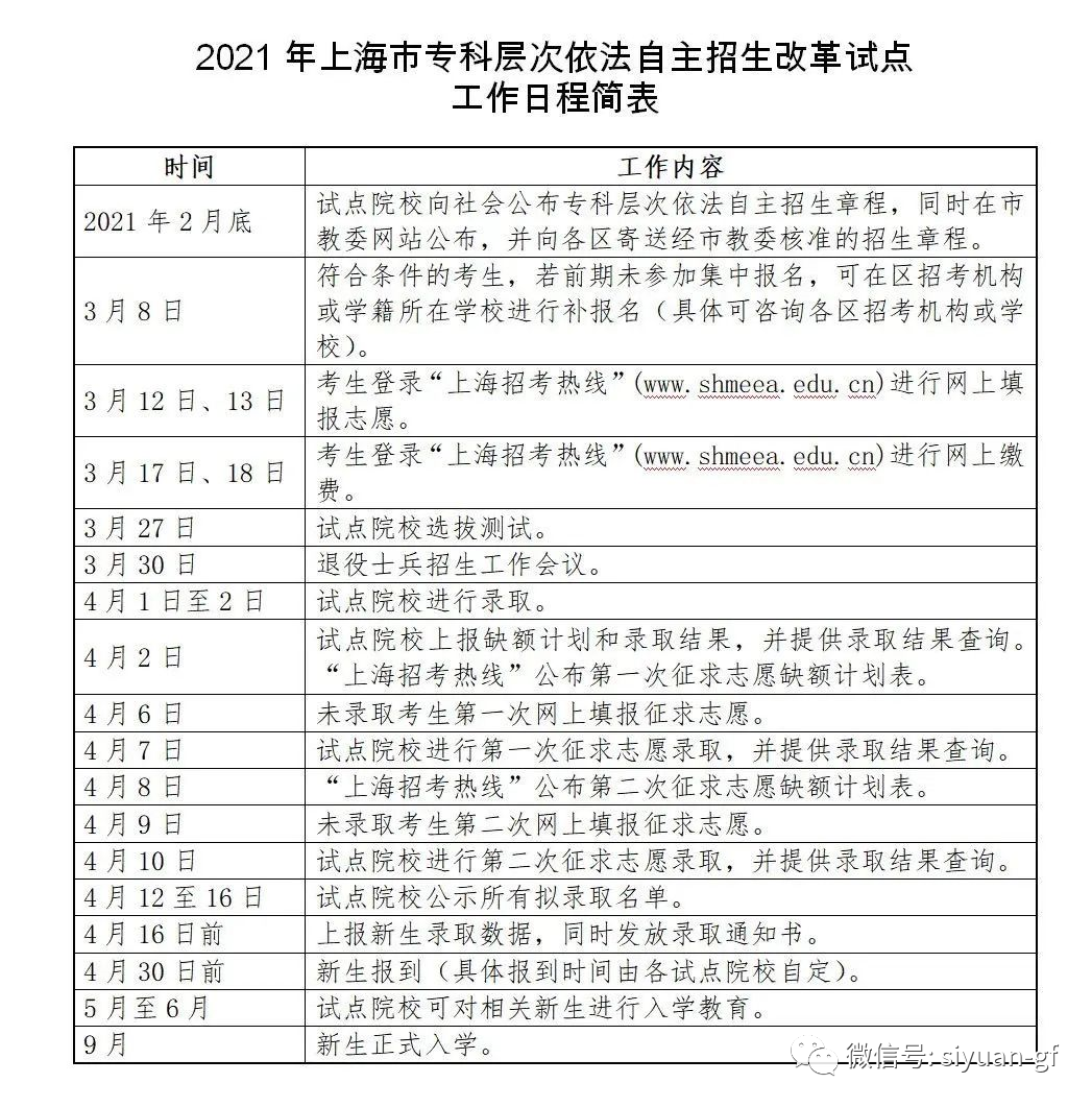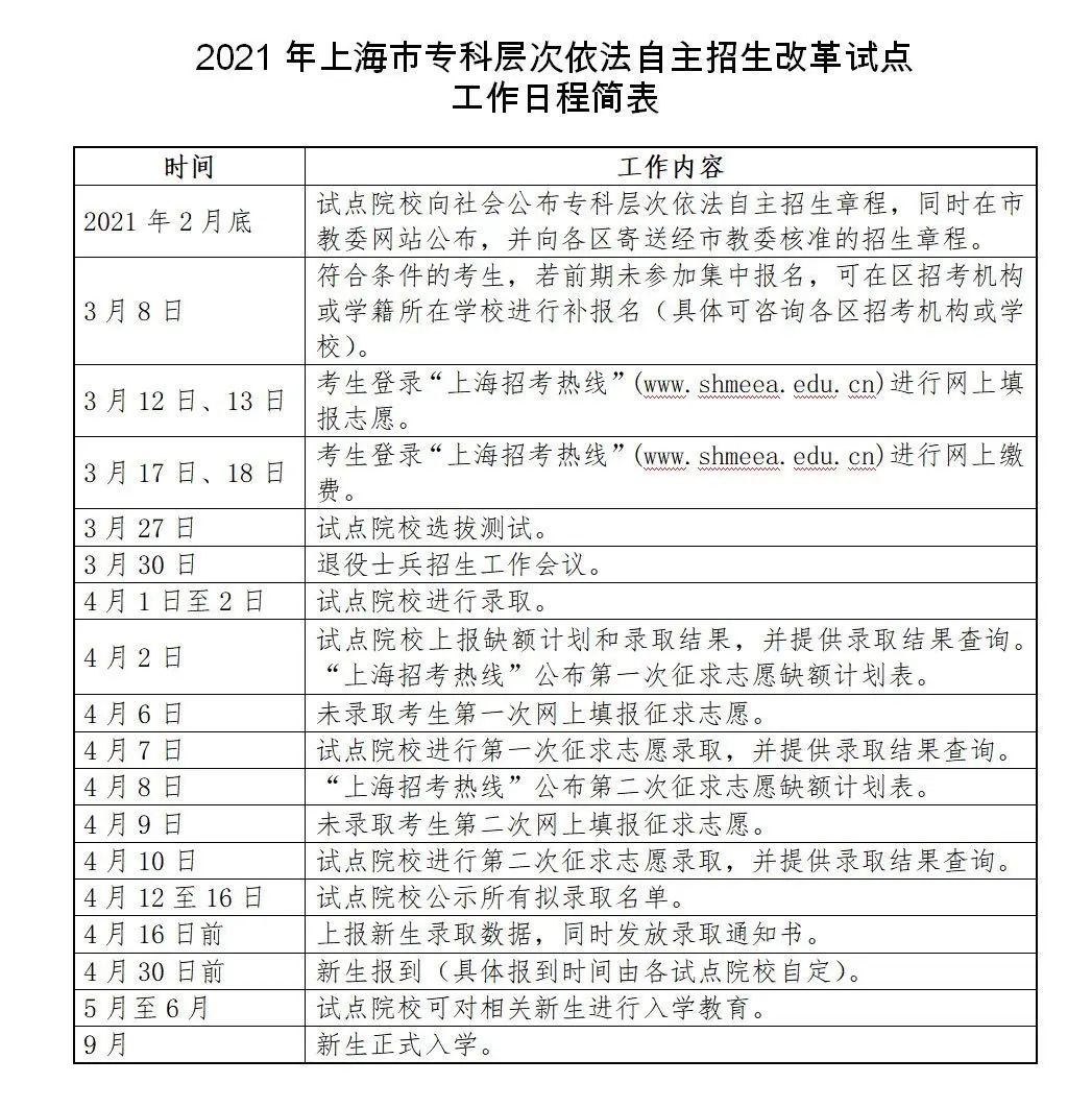 2021年本市共有30所試點院校參加專科層次依法自主招生招生章程已全部公布:30所試點院校的共計招生12577人。其中三校生招生8961人!