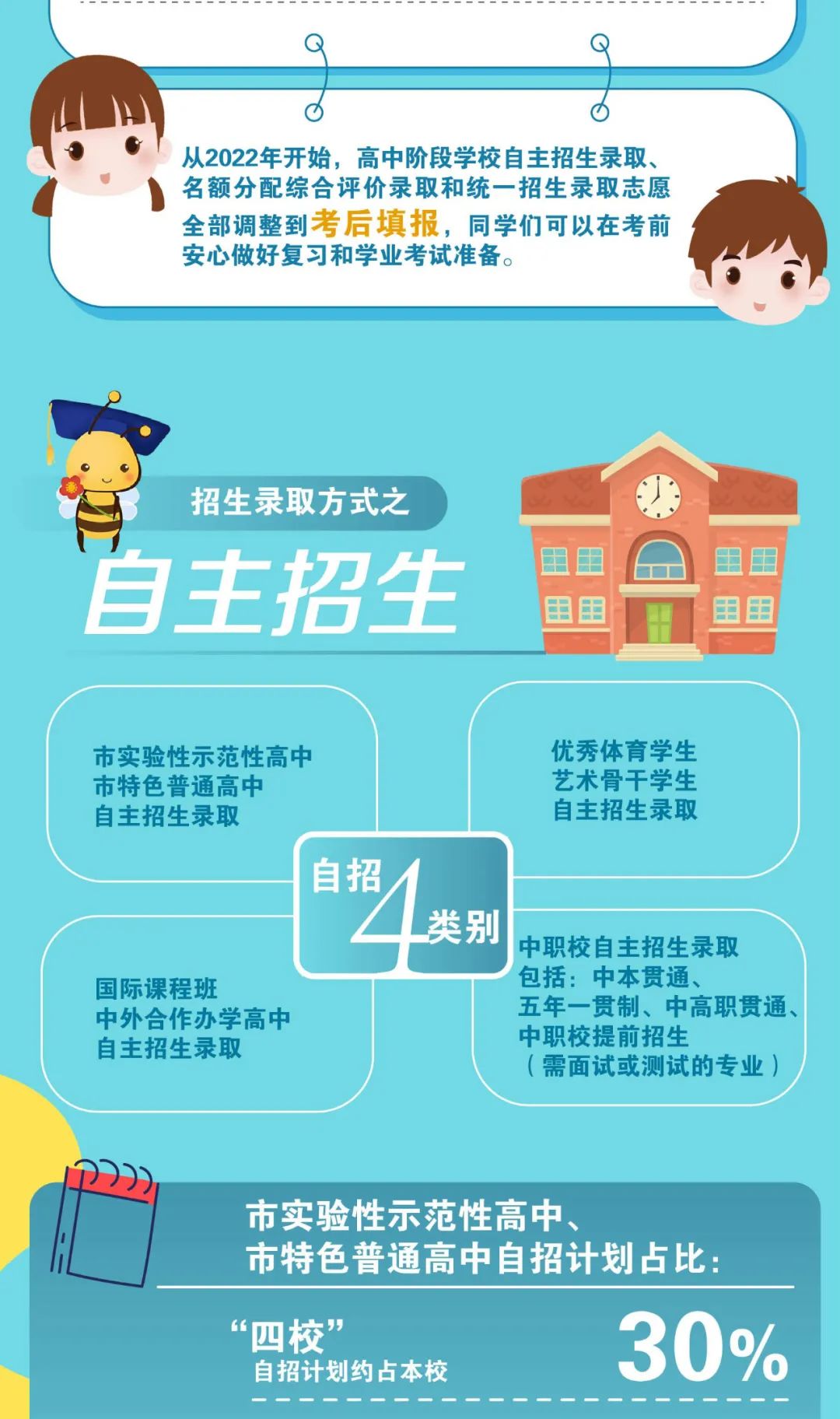 為探索建立初中學(xué)業(yè)考試與綜合素質(zhì)評價相結(jié)合的多元招生錄取機(jī)制,《中招若干意見》明確,2022年本市中招錄取方式由原來的5種(自薦、推薦、零志愿、名額分配和統(tǒng)一招生)調(diào)整為3種,包括自主招生錄取、名額分配綜合評價錄取、統(tǒng)一招生錄取。各批次志愿均在考后填報,自主招生錄取(公辦普通高中)和名額分配綜合評價錄取劃定同一最低投檔控制分?jǐn)?shù)線。