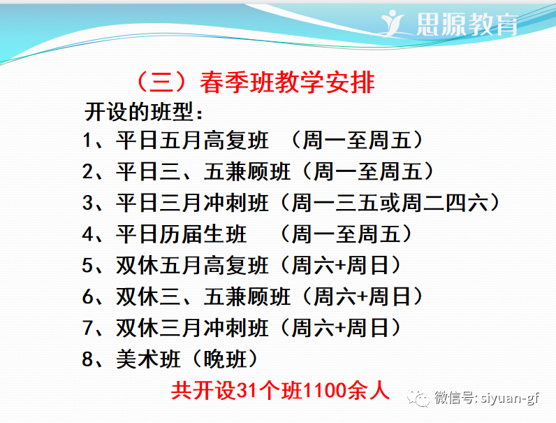 會議上,黃老師首先對思源教育三校生高復這幾年的成績向家長做了簡單的匯報。好的成績離不開成熟科學的教學體系,思源三校生配備了三支專業的隊伍:負責課程設置、教材編寫的教研團隊;負責授課的專業教師隊伍;負責班級管理的全職班主任團隊,三位一體,全方面的給予學生最大的幫助。