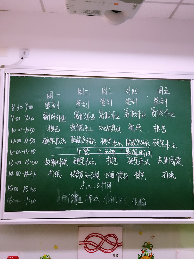 每一天的活動(dòng)安排,都會(huì)在黑板上用粉筆字清晰的寫(xiě)著,家長(zhǎng)早上送孩子來(lái)的時(shí)候,就可以初步了解暑托班一天的情況了。