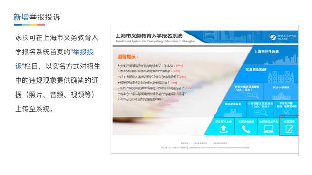 今年“上海市義務(wù)教育入學(xué)報名系統(tǒng)”開辟實(shí)名“舉報投訴”通道,發(fā)現(xiàn)有違規(guī)情節(jié)的,學(xué)生和家長可對招生中的違規(guī)現(xiàn)象提供確鑿的證據(jù)(照片、音頻、視頻等),進(jìn)行實(shí)名舉報。