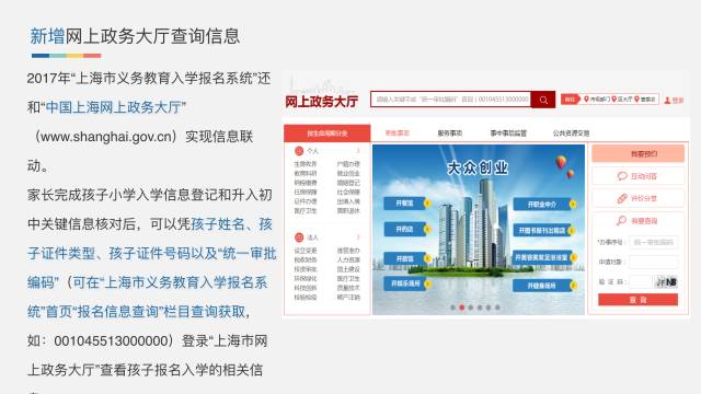 2017年“上海市義務(wù)教育入學(xué)報名系統(tǒng)”還和“中國上海網(wǎng)上政務(wù)大廳”(www.shanghai.gov.cn)實(shí)現(xiàn)信息聯(lián)動。家長完成孩子小學(xué)入學(xué)信息登記和升入初中關(guān)鍵信息核對后,可以憑“孩子證件號碼”、“孩子姓名”以及“統(tǒng)一審批編碼”(可在“上海市義務(wù)教育入學(xué)報名系統(tǒng)”首頁“報名信息查詢”欄目查詢獲取,例如:001045513000000)登錄“中國上海網(wǎng)上政務(wù)大廳”查看孩子報名入學(xué)的相關(guān)信息。