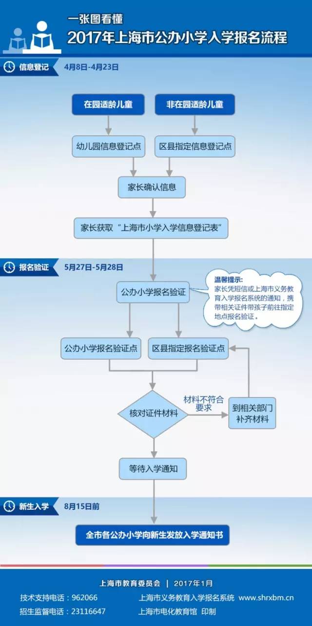 2017年,本市繼續(xù)實(shí)行小學(xué)一年級新生入學(xué)信息登記辦法。年滿6周歲(2010年9月1日~2011年8月31日出生)、本市戶籍的適齡兒童和符合條件的非本市戶籍的適齡兒童,均須先進(jìn)行入學(xué)信息登記。2月24日前,家長須對適齡兒童在讀幼兒園提供的相關(guān)人口信息、靈活就業(yè)信息進(jìn)行比對確認(rèn),如與實(shí)際情況不符,應(yīng)到有關(guān)部門補(bǔ)辦或更正信息;符合入學(xué)條件的非本市戶籍適齡兒童所持的《上海市臨時居住證》上的居住地址,還應(yīng)與父母所持居住證(或臨時居住證)上的居住地址相一致。4月8日~4月23日,在園適齡兒童家長在幼兒園登記孩子入學(xué)信息,獲取小學(xué)入學(xué)信息登記表;未入園適齡兒童家長在各區(qū)縣指定地點(diǎn)登記孩子入學(xué)信息,獲取小學(xué)入學(xué)信息登記表。5月27日~5月28日為全市公辦小學(xué)報名驗(yàn)證日,各區(qū)指定的報名驗(yàn)證點(diǎn)對已填寫入學(xué)信息登記的適齡兒童以及家長的證件進(jìn)行現(xiàn)場核對。