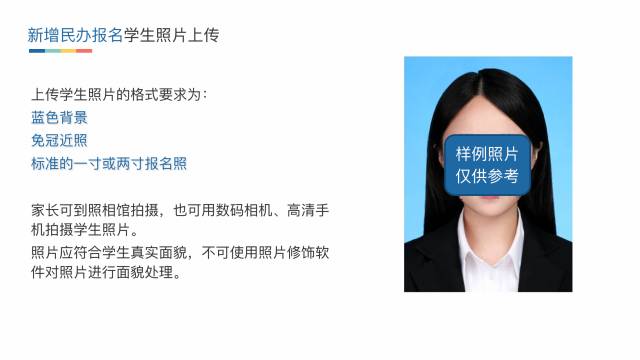 上傳學(xué)生照片的格式要求為:藍(lán)色背景、免冠近照、標(biāo)準(zhǔn)的一寸或兩寸報名照,家長可到照相館拍攝,也可用數(shù)碼相機(jī)、高清手機(jī)拍攝學(xué)生照片。照片應(yīng)符合學(xué)生真實(shí)面貌,不可使用照片修飾軟件對照片進(jìn)行面貌處理。