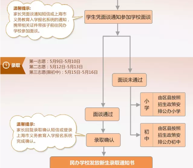 在5月1日至5月6日期間,家長通過手機接收民辦學(xué)校發(fā)送的面談通知短信,或者家長登錄“上海市義務(wù)教育入學(xué)報名系統(tǒng)”(www.shrxbm.cn)點擊“幼升小報名信息查詢(公辦、民辦)”查看民辦小學(xué)面談通知,點擊“民辦初中報名信息查詢”查看到民辦初中面談通知。