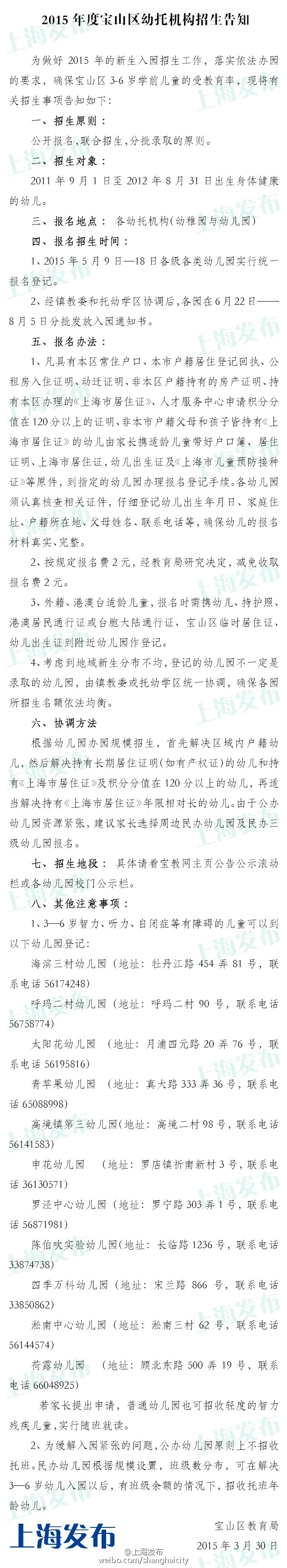 東方網4月7日消息:據上海市政府新聞辦公室官方微博消息,寶山區今天公布2015寶山幼兒園對口地段表和實施意見。寶山區幼兒園招生對象為2011.9.1-2012.8.31出生的適齡幼兒。5月9日-5月18日分批報名登記,幼兒園根據實際情況公布報名登記時間。對口地段表和實施意見下圖。