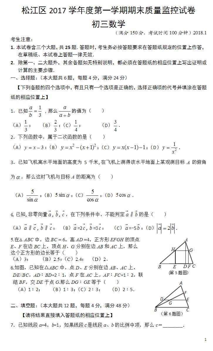 2018上海松江區一??奸_考,思源教育小編第一時間整理了數學考卷的真題和答案解析,分享給大家。其他區的同學們可以參考松江區的考點和難度,做最后的沖刺復習。