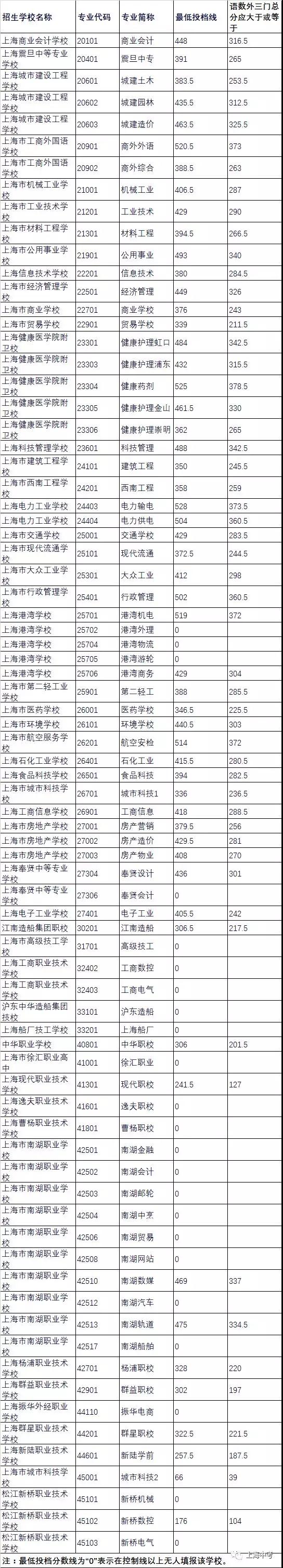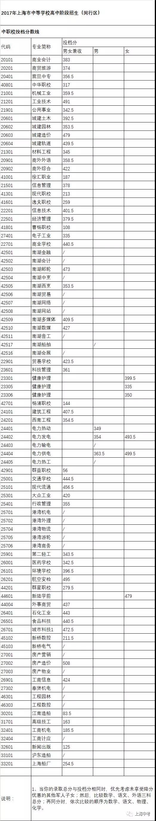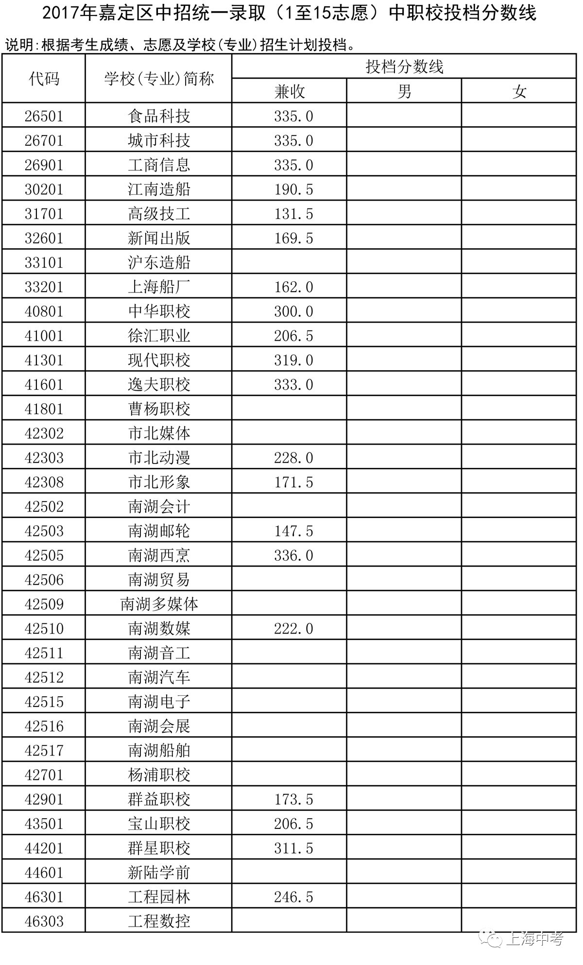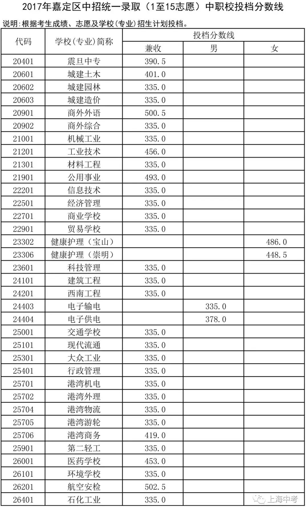 2017年中職校自主招收隨遷子女中高職各專業錄取最低分數線