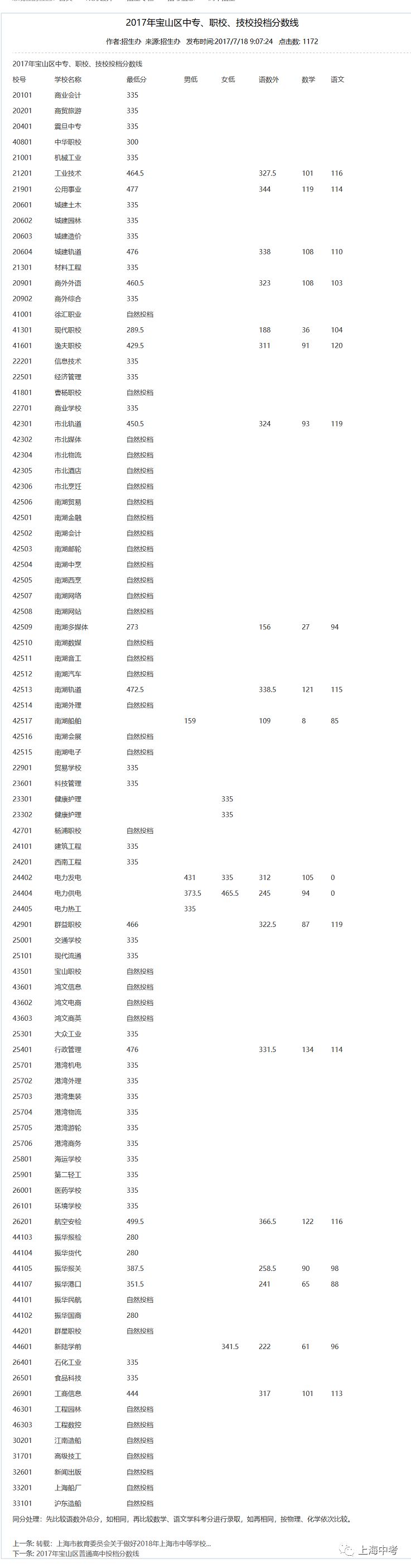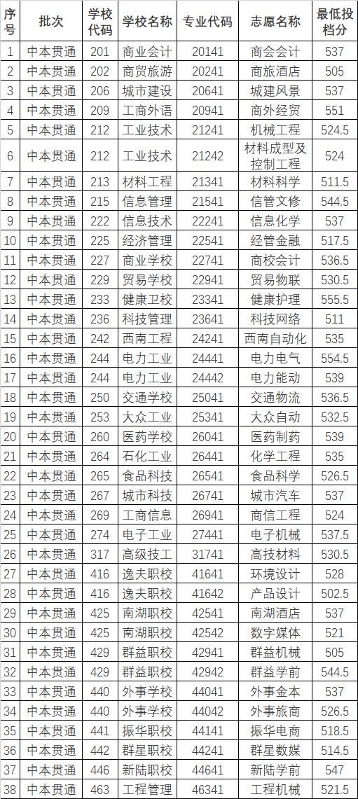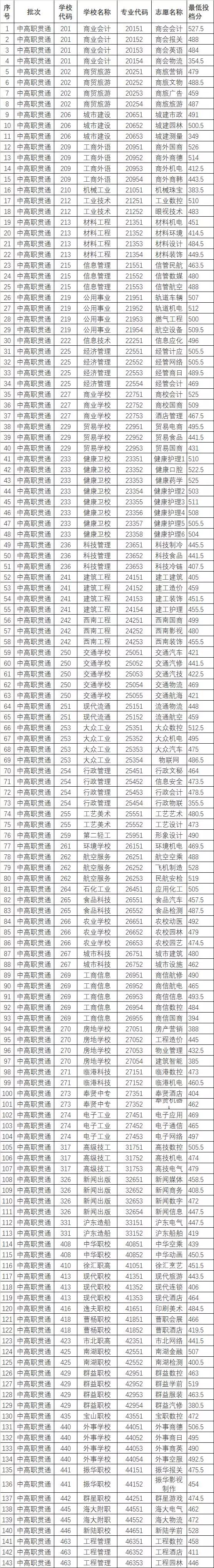 2017年中招中職校提前批中本、中高職各專業錄取最低分數線
